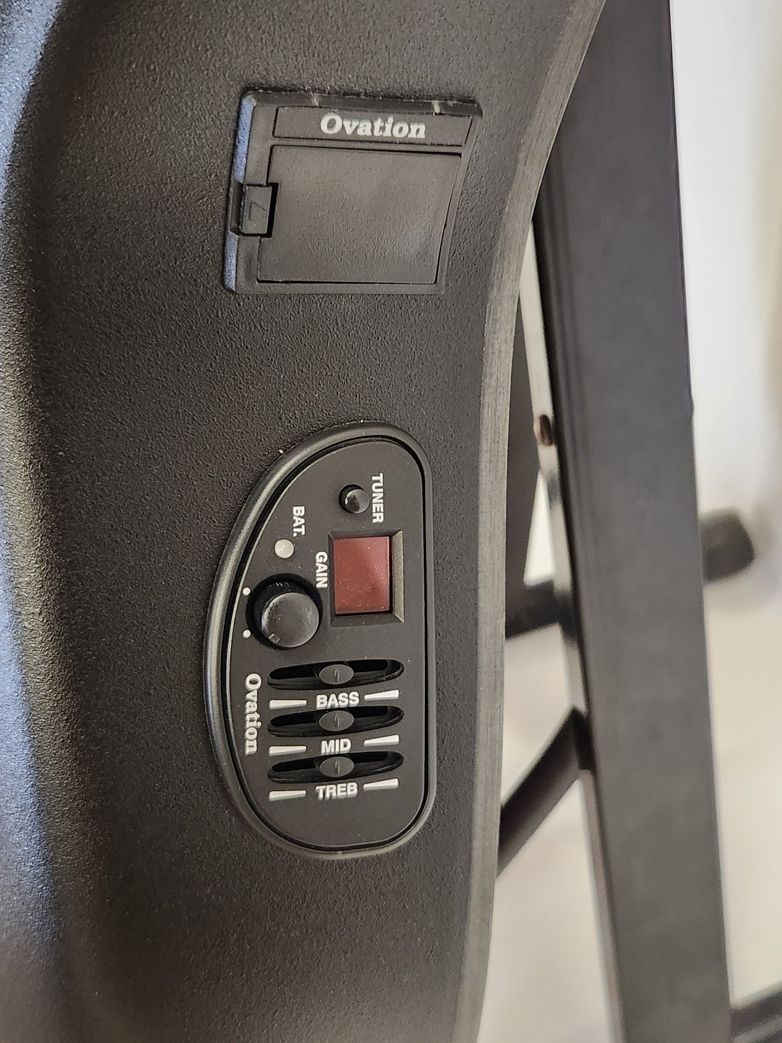 - Ovation preamp with built in tuner and 3 band EQ